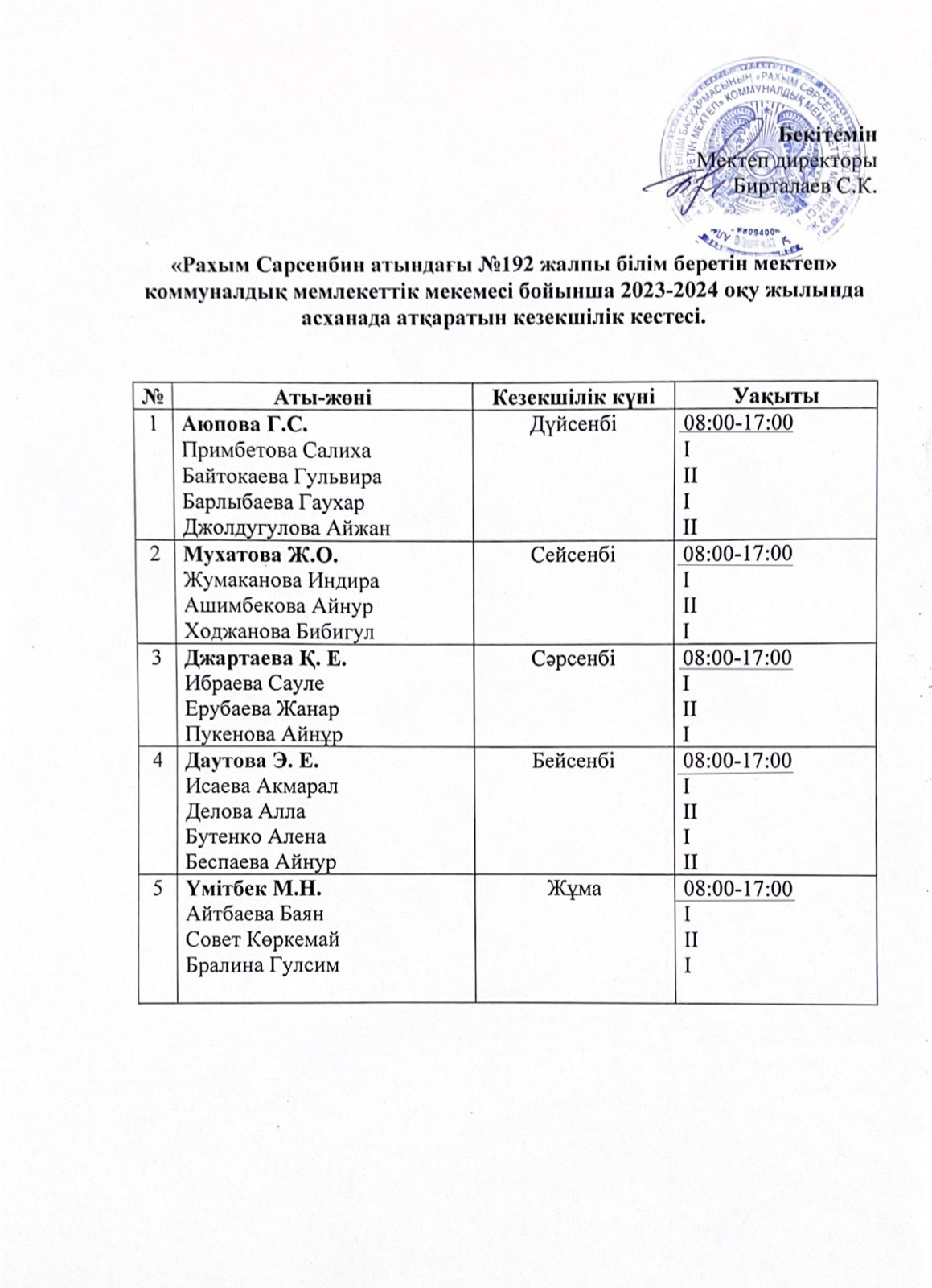 2022-2023 жылында асханада атқарылатын кезекшілік кестесі