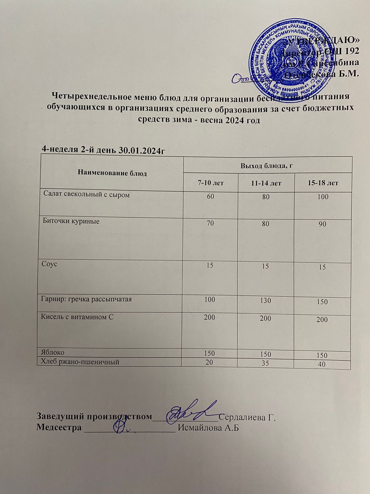 Күнделікті меню 30.01.2024