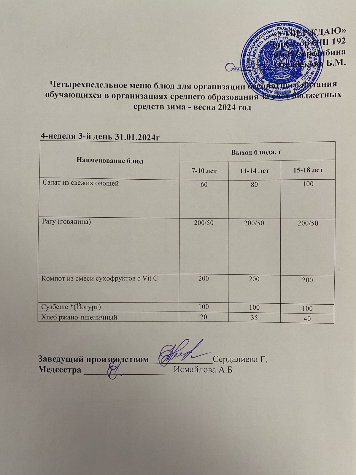 Күнделікті меню 31.01.2024