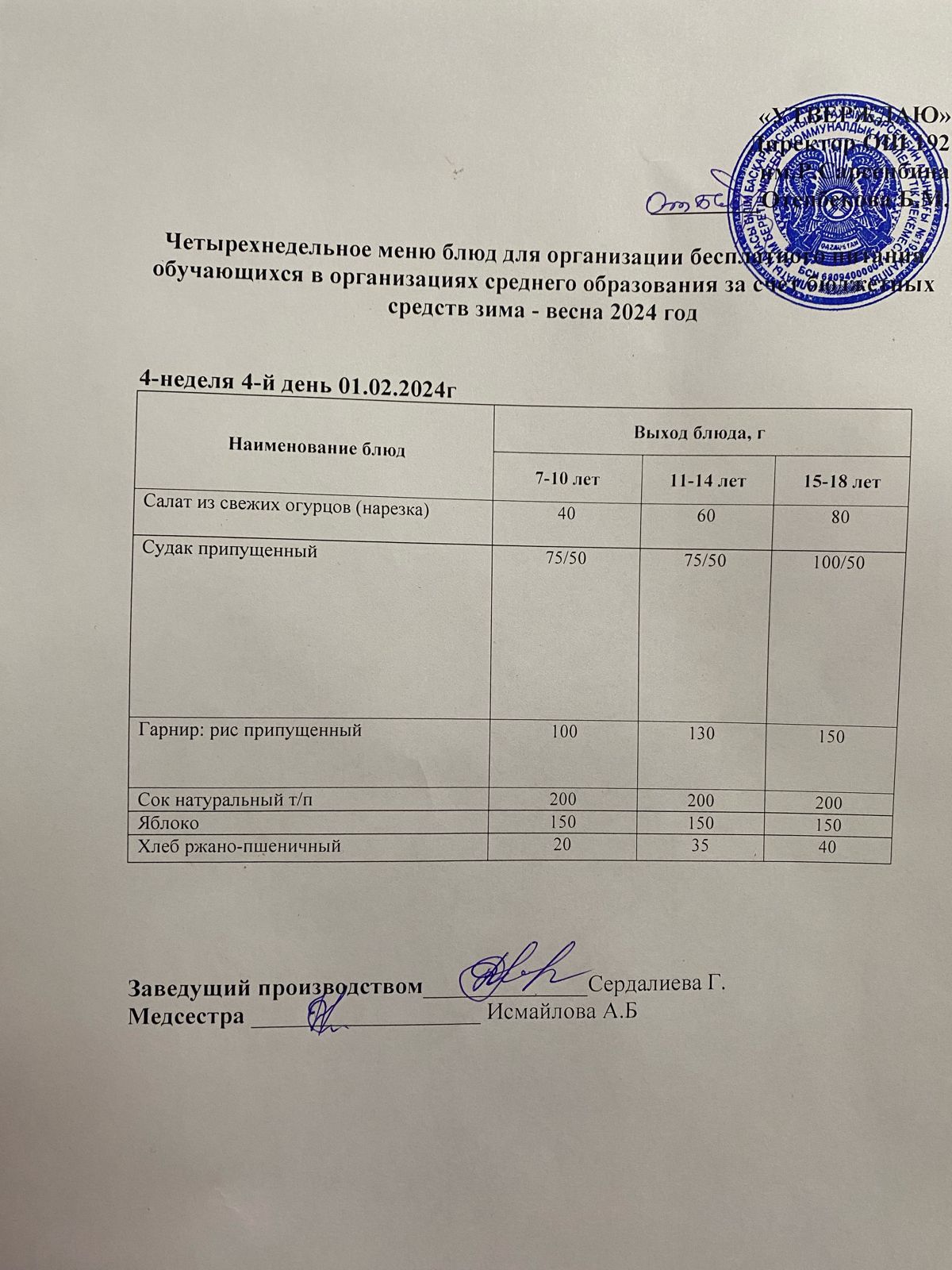 Күнделікті меню 01.02.2024