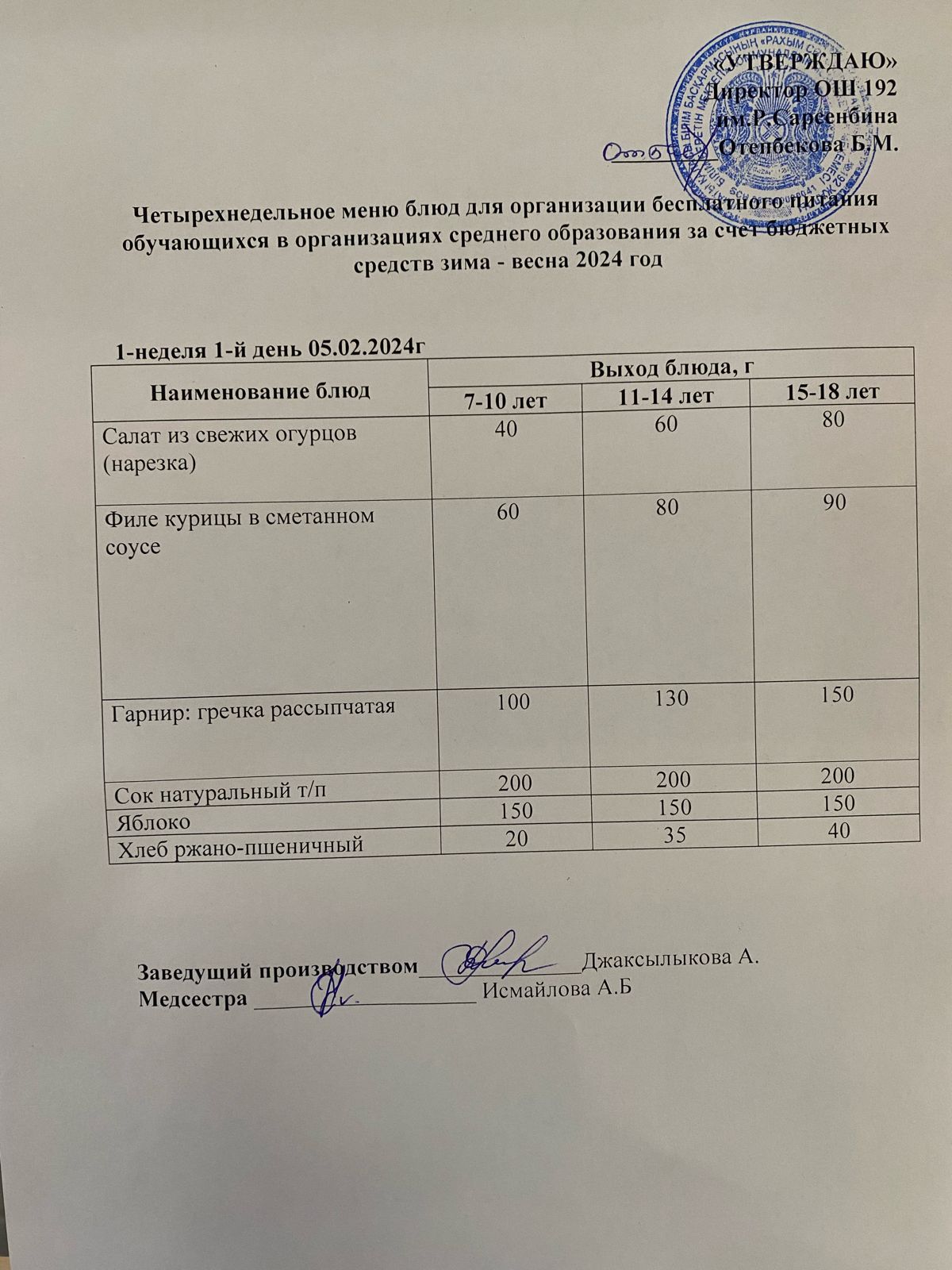 Күнделікті меню 05.02.2024