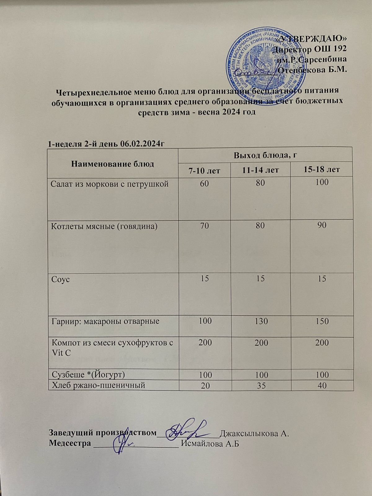 Күнделікті меню 06.02.2024