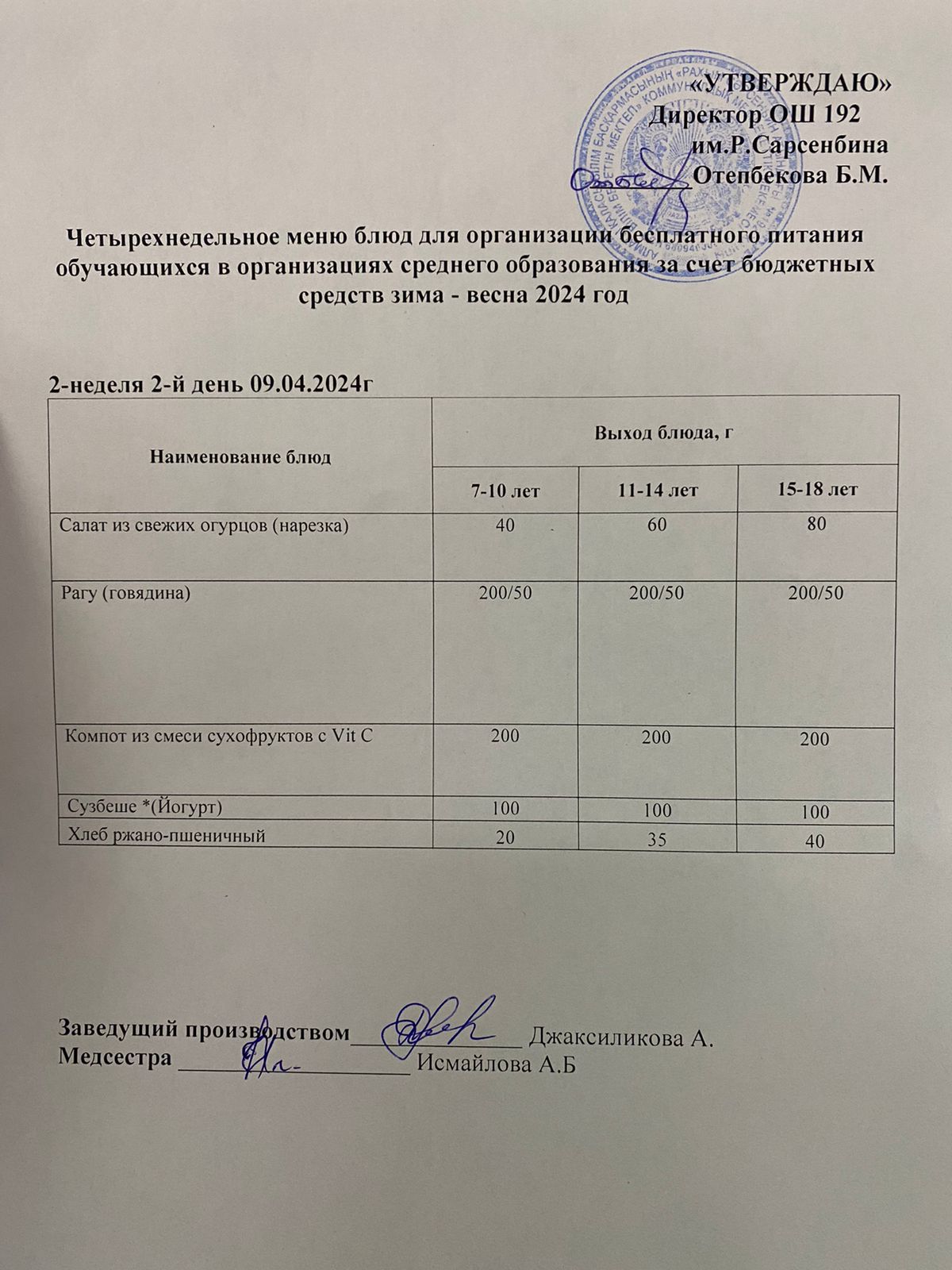 09.04.2024 Күнделікті меню