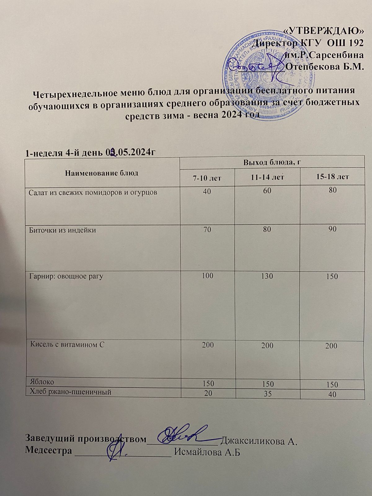 02.05.2024 Күнделікті меню