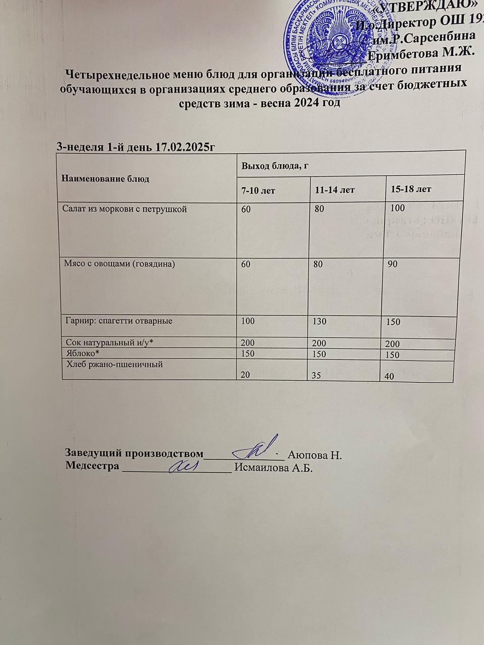Тамақтануды ұйымдастыру бойынша жұмыс жоспары
