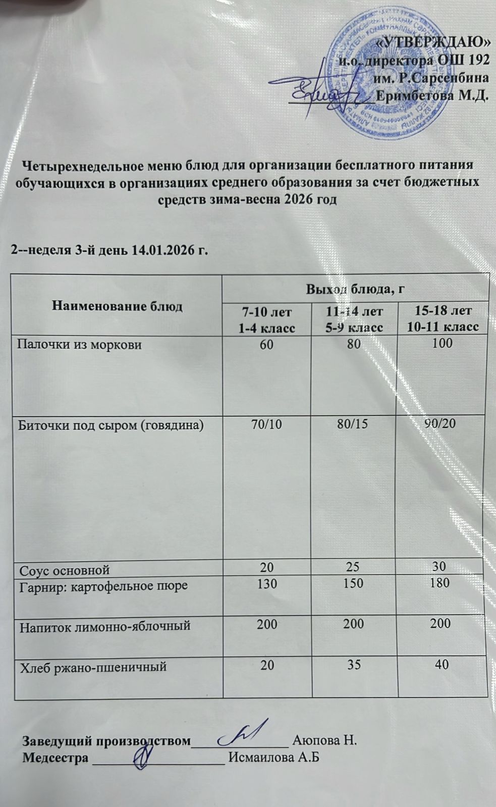 Күнделікті ас мәзірі 14.01.2026