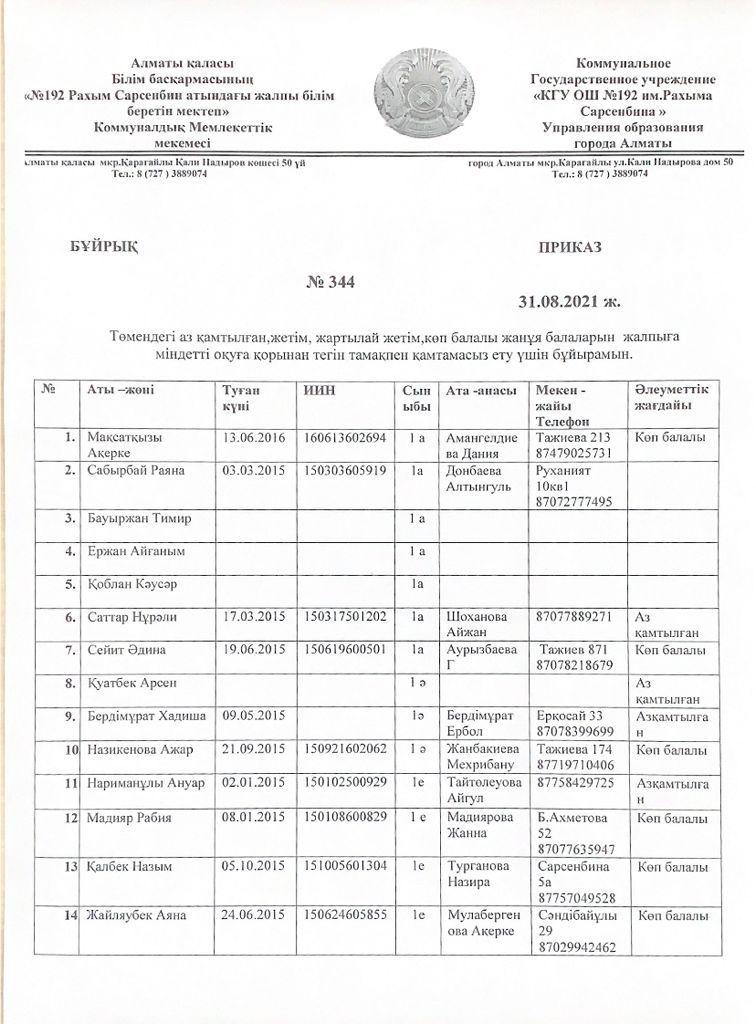 Бұйрық №344 Тегін тамақпен қамтамасыз ету