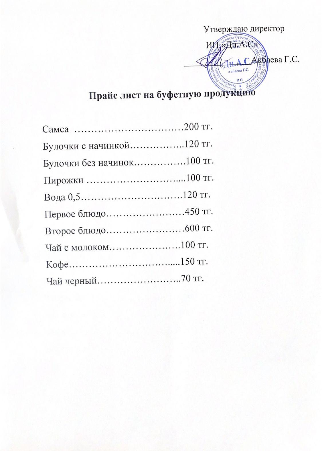 Прайс лист на буфетную продукцию