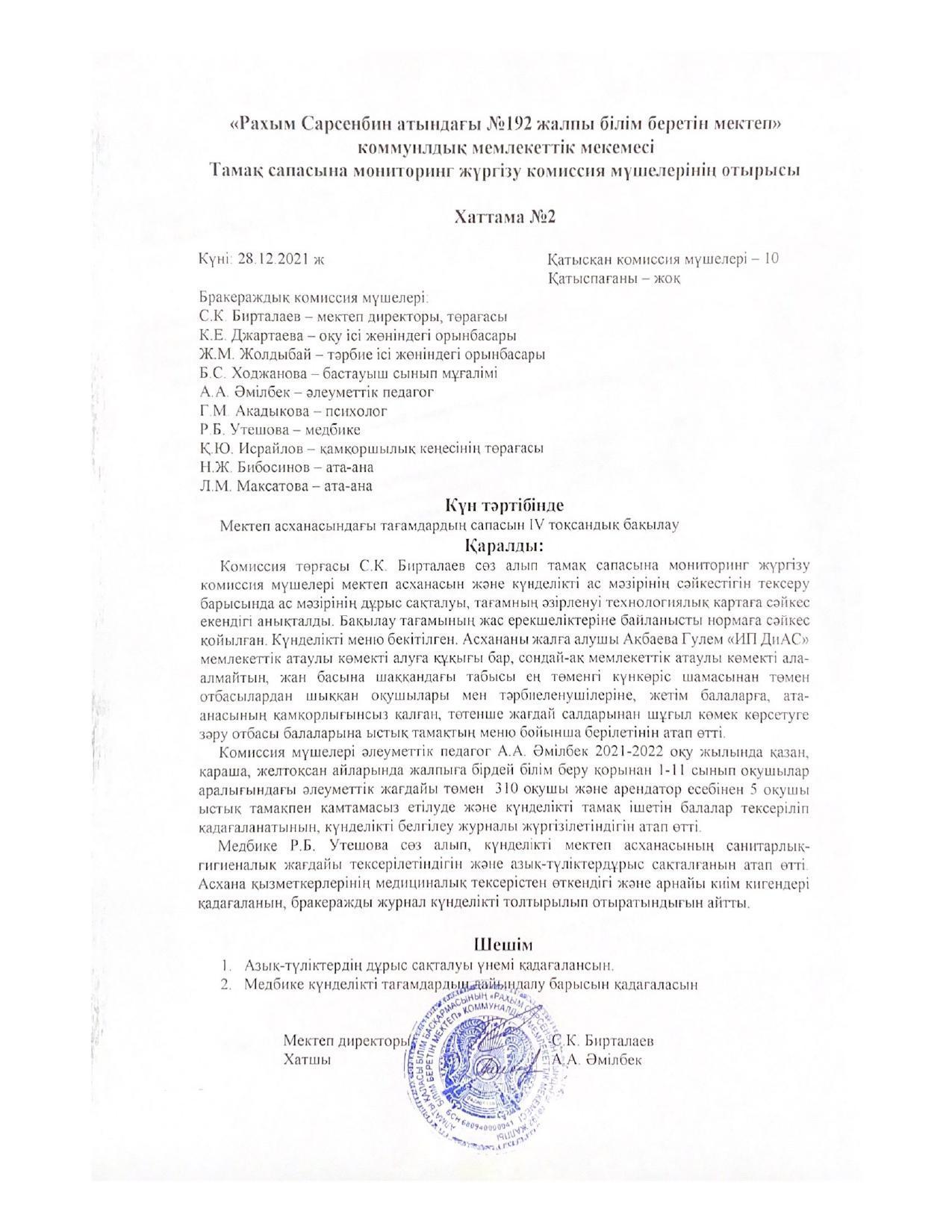 Тамақтануды ұйымдастыру бойынша жұмыс жоспары