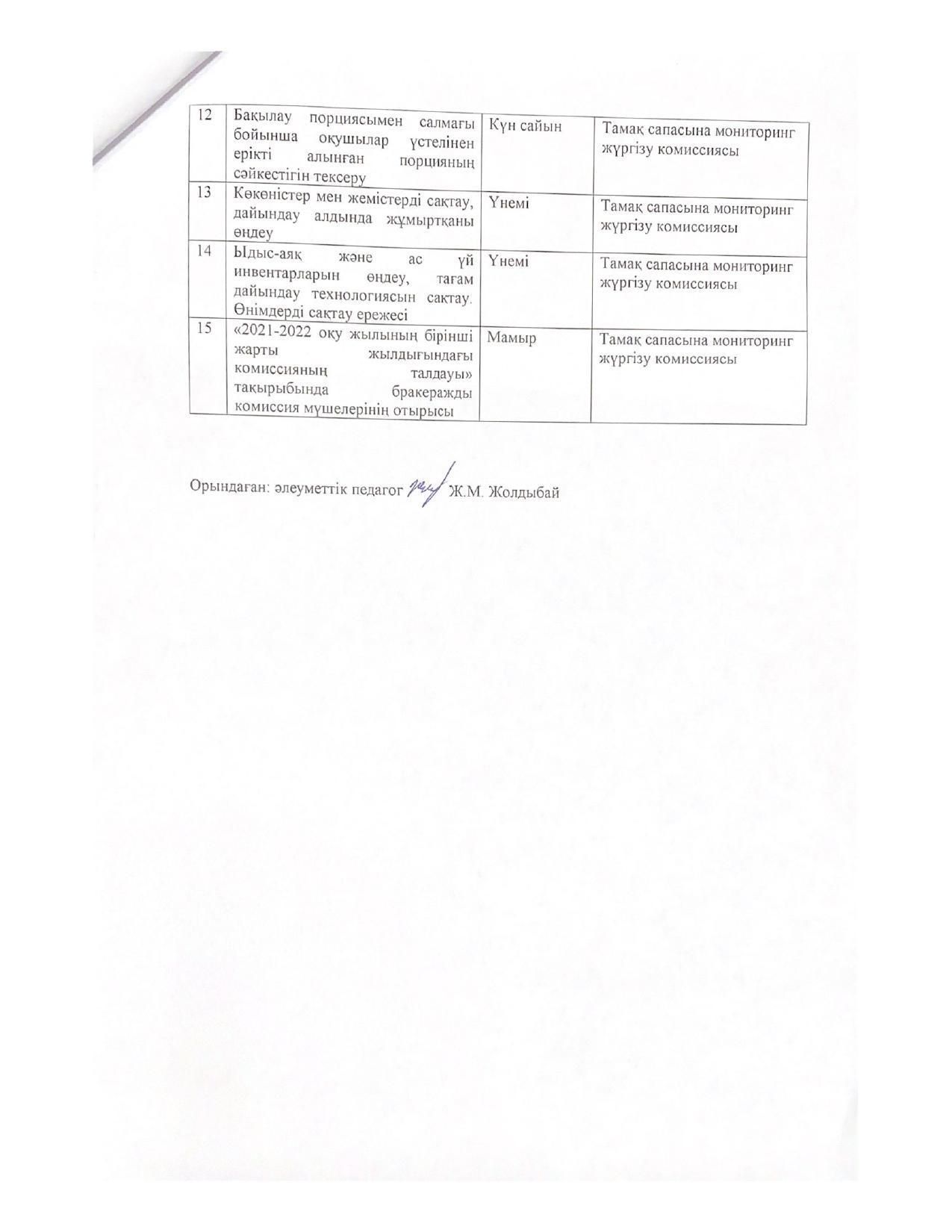 01 сентябрь 2021 0 1 2 3 4 5 Тамақ сапасына мониторинг жүргізу комиссиясының жұмыс жоспары 2021-2022 оқу жылы
