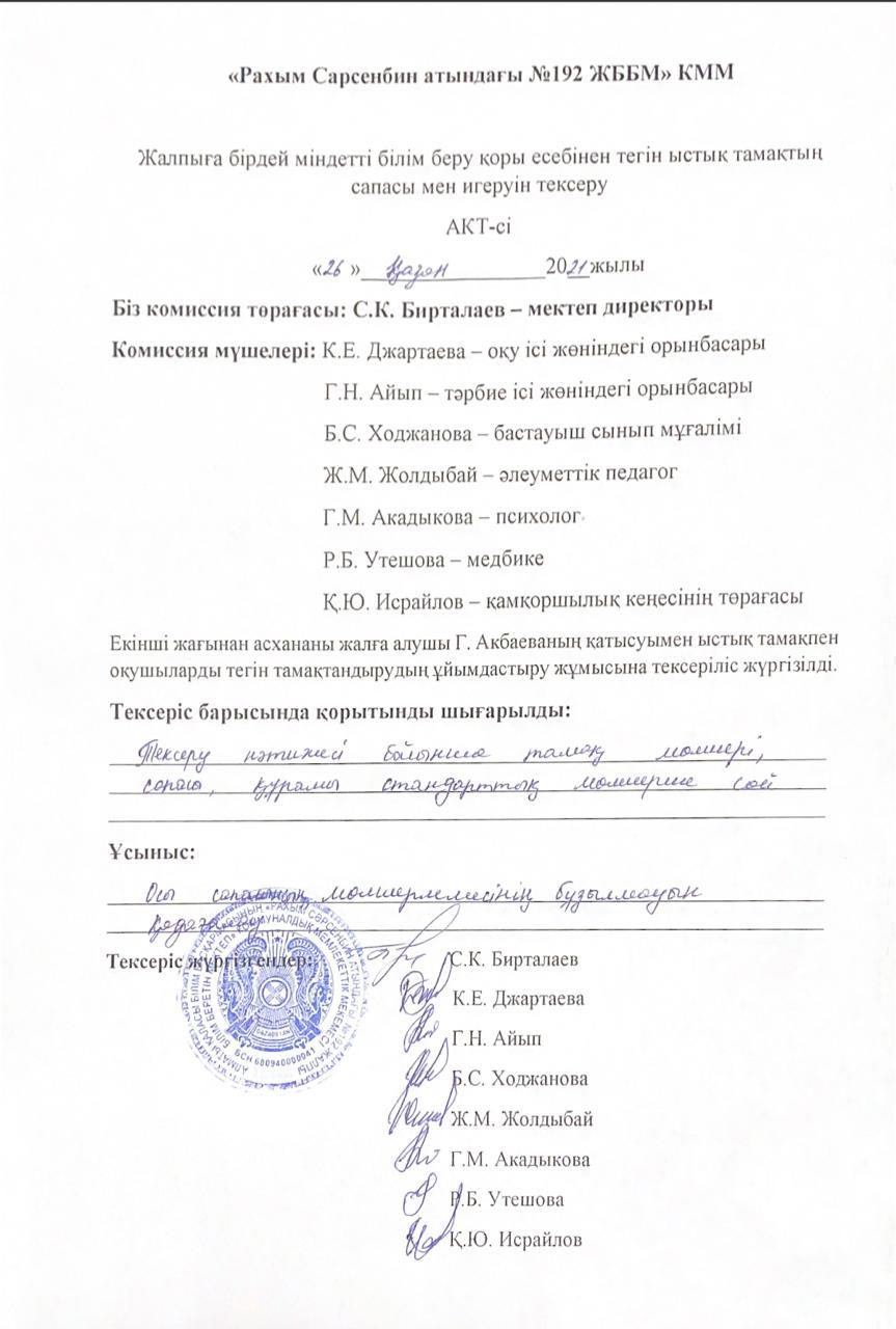 Тамақтың сапасы мен игеруін тексеру АКТ-сі 27.09.2021