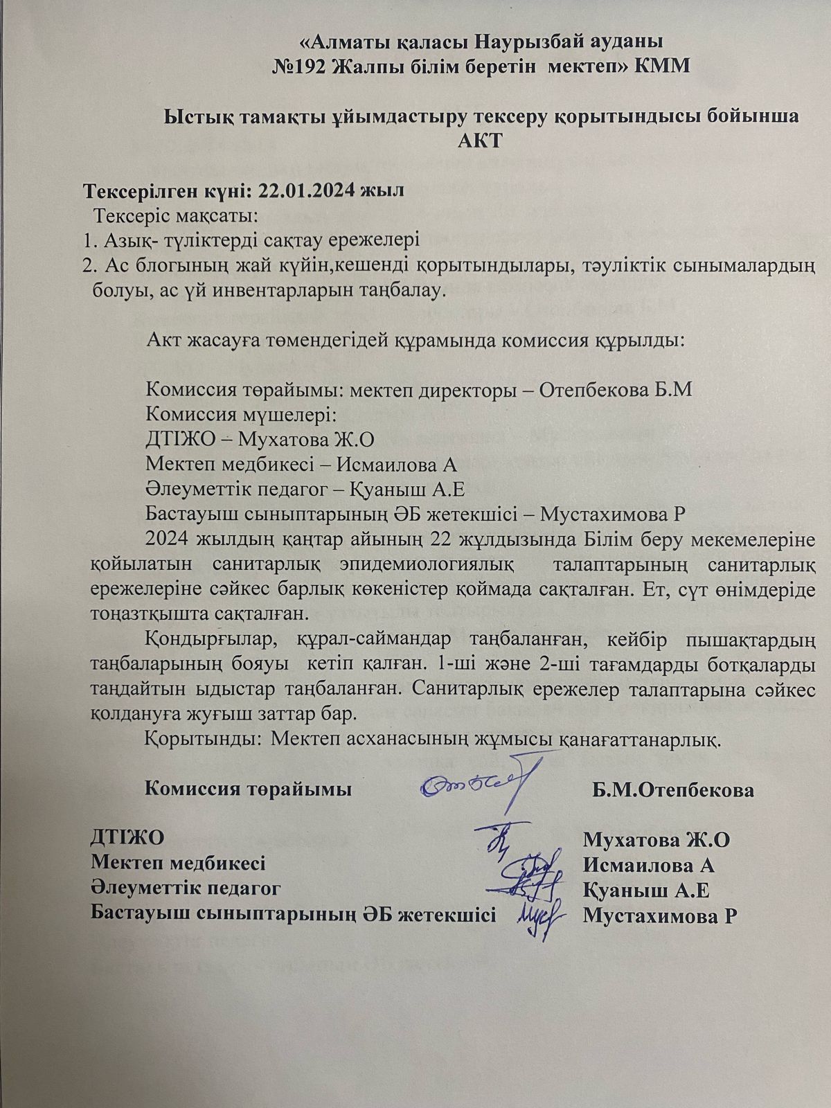 Ыстық тамақты ұйымдастыру, тексеру қорытындысы бойынша АКТ