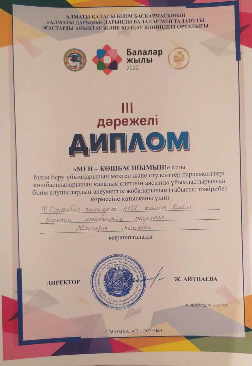 14 ноябрь 2022 0 1 2 3 4 5 "МЕН КӨШБАСШЫМЫН" "МЕН КӨШБАСШЫМЫН" атты білім беру ұйымдарының оқушылары мен студенттер парламенттері көшбасшыларының қалалық слеты аясында Наурызбай ауданының және мектеп намысын қорғап келген оқушылар Жұмахан Алина 11 "Ә"сынып оқушысы мен Жансерік Алихан 11 "А" сынып оқушысы ІІ-дәрежелі дипломмен марапатталды.