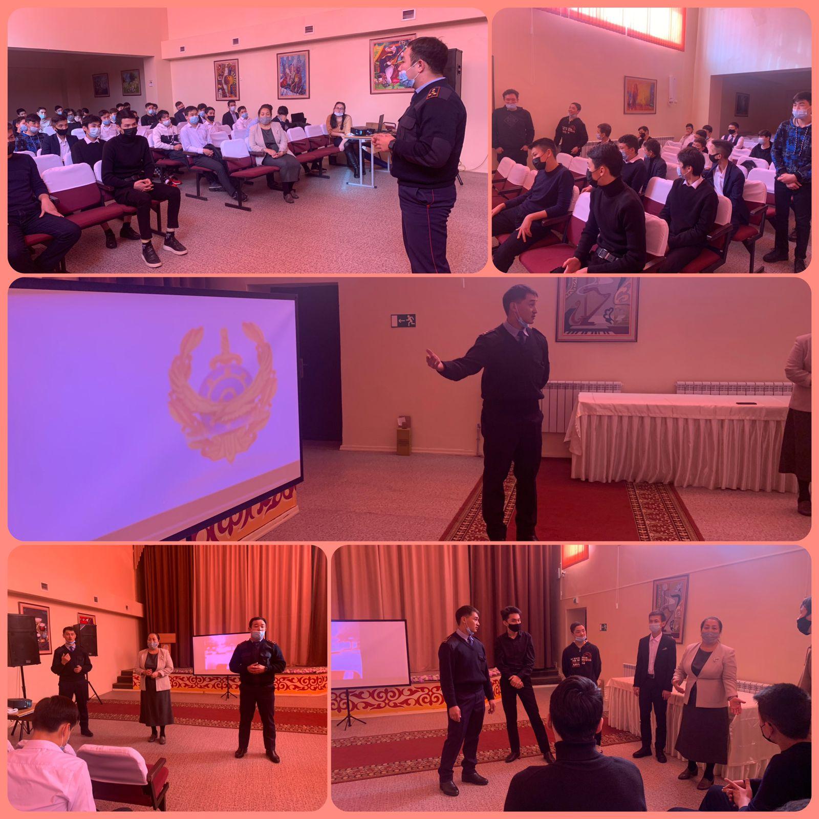 Мектебімізде “Жасөспірімдер арасындағы құқықбұзушылықтың алдын алу” тақырыбында 9-10 сынып оқушылары Алматы қаласы Наурызбай АПБ ЖПҚБ ЮПБ УПИ полиция аға лейтенаты Әсенов Медет Қанатұлы және Полиция капитаны Нұғыманов Ермек Бекқалиұлы КТІЖ полицияның учаскелік инспекторларымен кездесті. Кездесуге ДТІЖО, мектеп педагог-психологтары және аға тәлімгермен “Болашақ” өзін-өзі басқару ұйымының мүшелері қатысты.