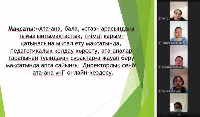 Мақсаты: «Ата-ана, бала, ұстаз» арасындағы тығыз ынтымақтастық, тиімді қарым-қатынасына ықпал ету мақсатында, педагогикалық қолдау көрсету, ата-аналар тарапынан туындаған сұрақтарға жауап беру мақсатында апта сайынғы "Директорлық сенбі – ата-ана үні" онлайн-кездесу.