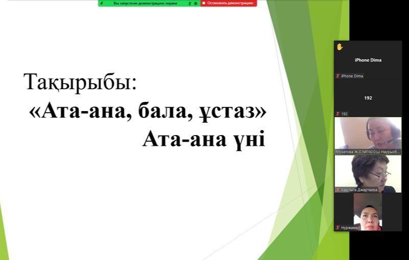 Алматы қаласы Наурызбай ауданы «Рахым Сәрсенбин атындағы №192 ЖББМ»КММ –де 20.11.2021 жылы «Ата-ана, бала, ұстаз» Ата-ана үні атты бірыңғай ата-аналар жиналысы zoom платформасы арқылы өткізілді.
