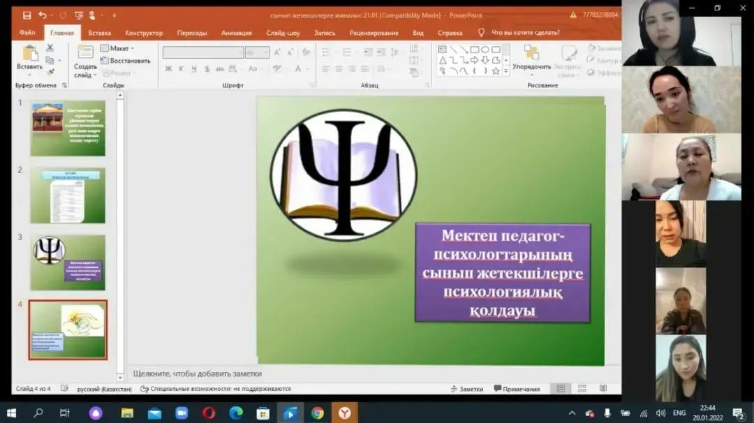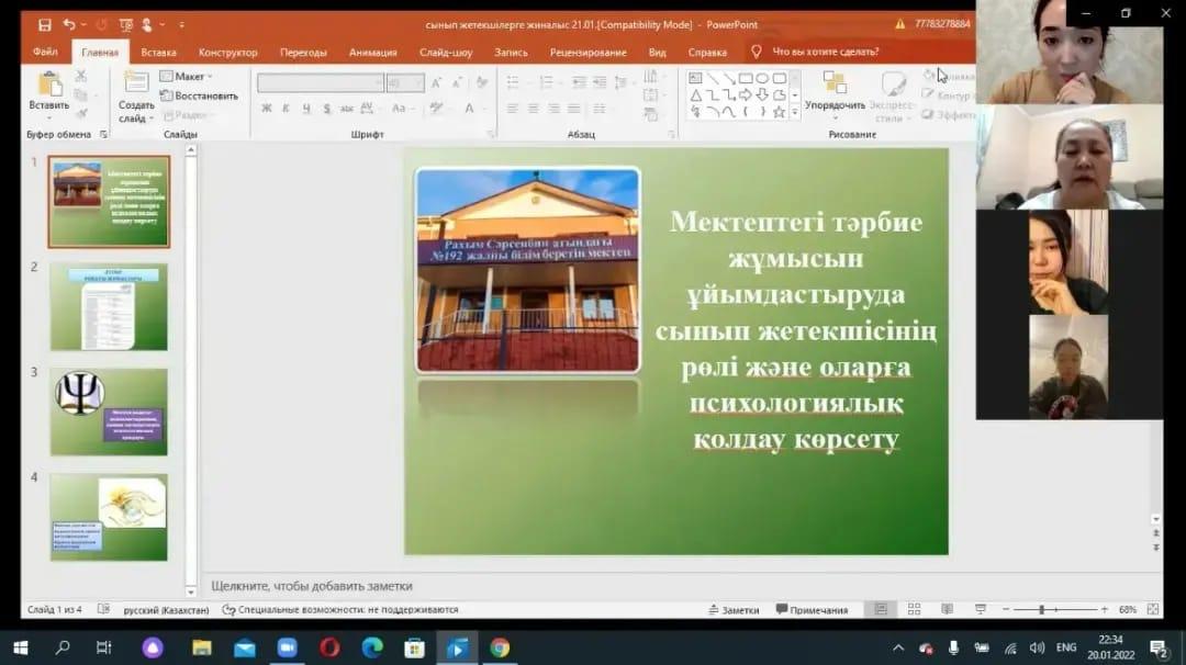Ағымдағы жылдың 20 қаңтар күні мектебіміздің 6 "А", 9 "Б", 10 "Ә" сыныптарының сынып жетекшілеріне мектебіміздің ДТІЖО, педагог-психолог, әлеуметтік педагогтың ұйымдастыруымен онлайн форматта ZOOM платформасы арқылы "Мектептегі тәрбие жұмысын ұйымдастыруда сынып жетекшінің рөлі және оларға психологиялық қолдау көрсету" тақырыбында жиналыс өткізілді.