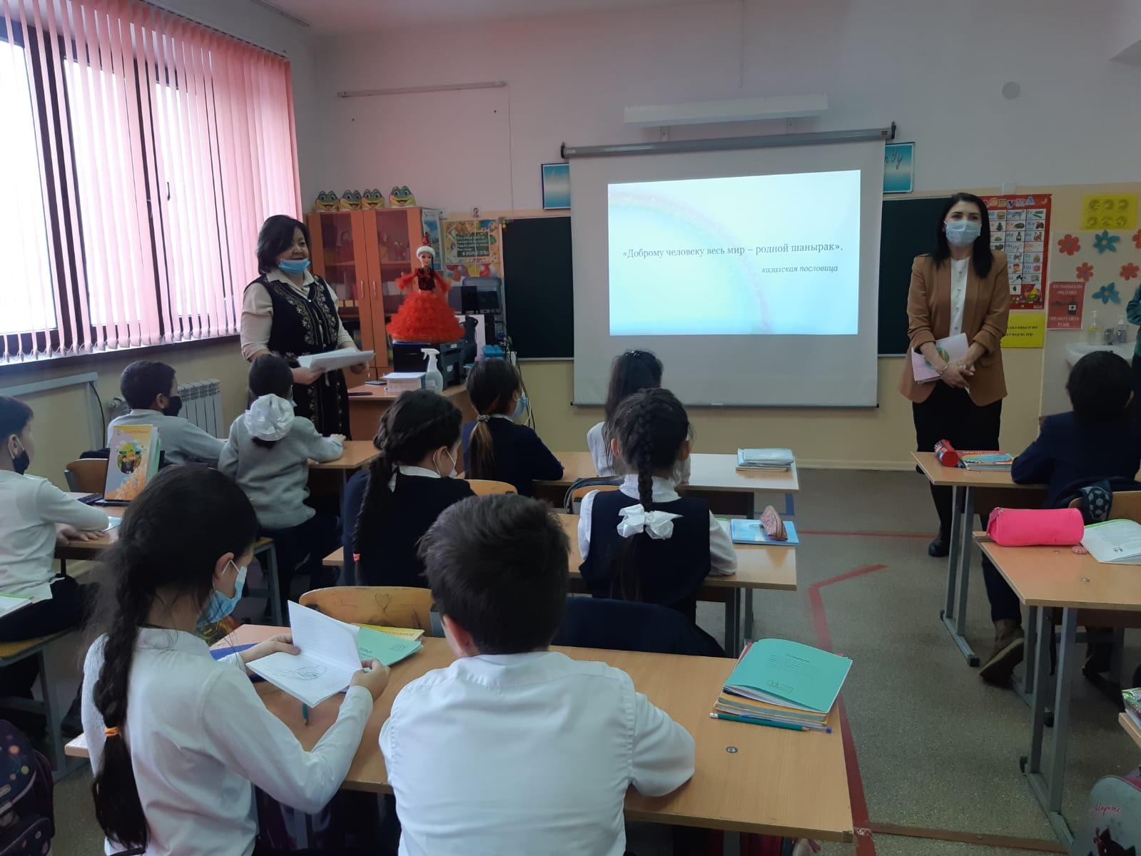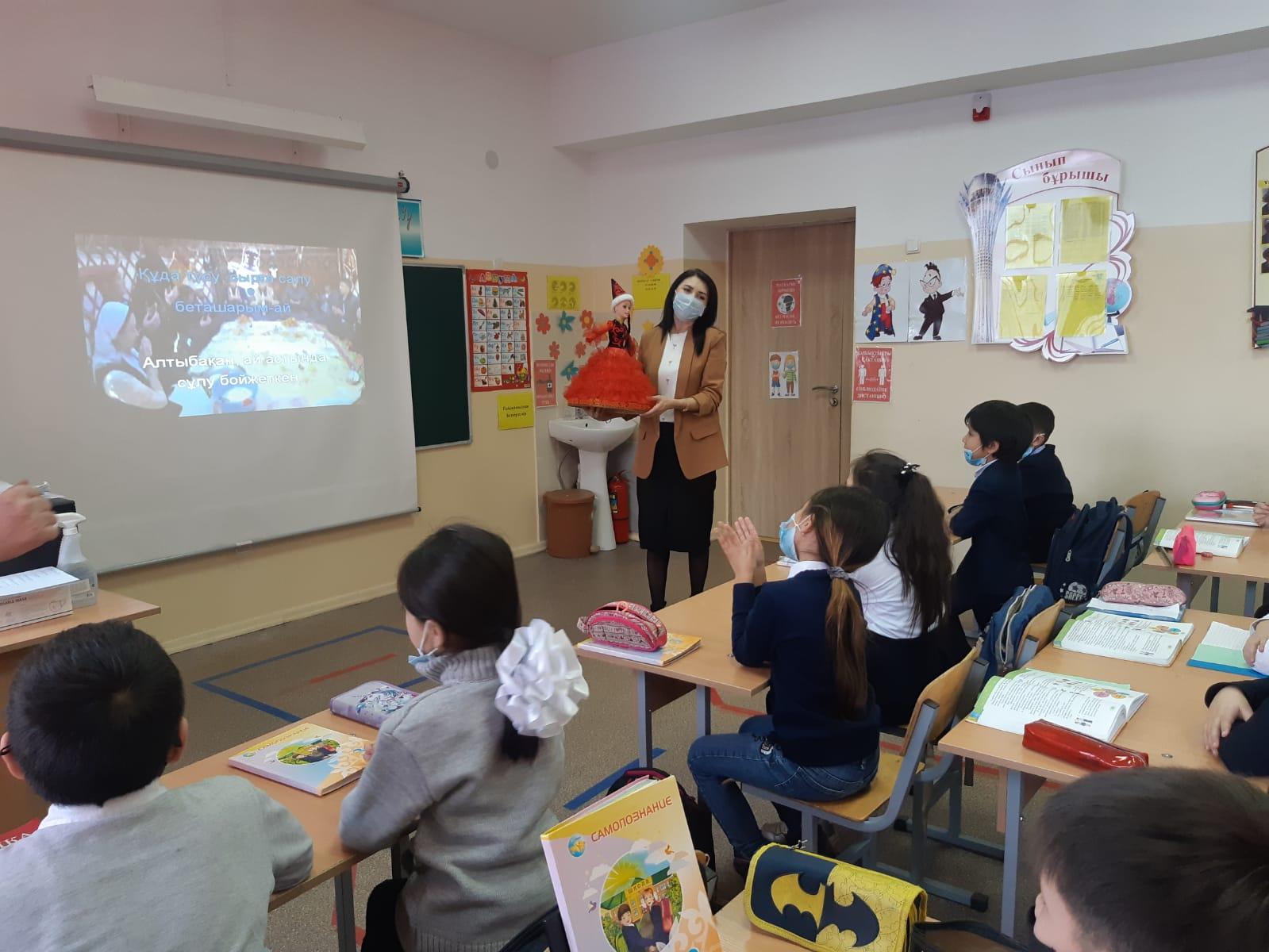 «Ұлттық құндылықтар – тәрбиенің түп қазығы» атты тақырыпта 3 «Г» сыныбында «өзін өзі тану» пәні мұғалімі , педагог- психолог Г.Акадыкова мен «музыка» пәні мұғалімі Г.Жакупова интреграцияланған сабақ өттікізді.