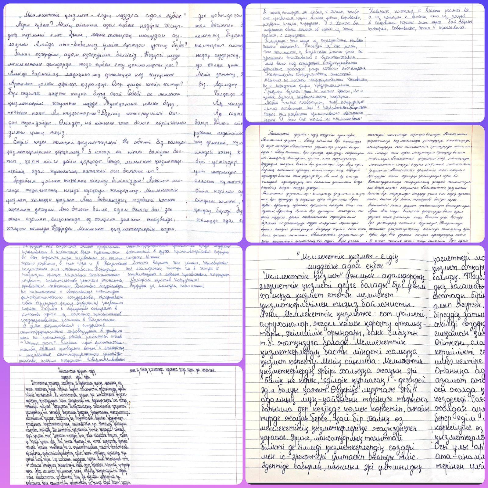 “Адал ұрпақ” ұйымының мүшелері арасында «Мемлекеттік қызмет - елдің мүддесі адал еңбек» тақырыбында 8-9 сынып оқушылар арасында эссе жазды.