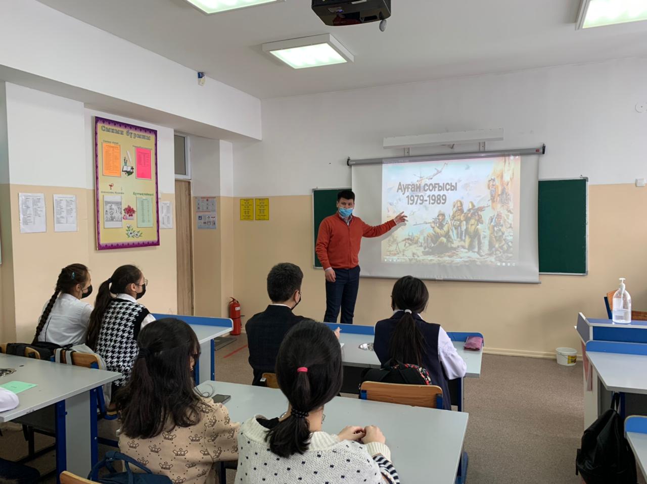 Ауған соғысына 33 жыл толуына орай, мектебіміздің география пәнінің мұғалімі Арын Олжас Омарұлы 8 “Д” сынып оқушыларына «Ауғанстан ардагерлеріне тағзым!» атты тақырыпта ашық сабақ өткізді.