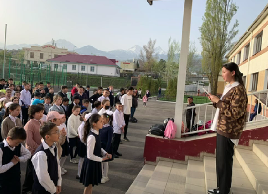 Мектебімізде дүйсенбілік саптық жиында кезекші 10 “А” сынып апталық атқарған жұмыстарының есебін өткізіп 10 “Ә” сыныбына апталық атқаратын жұмыстарды жолдады.