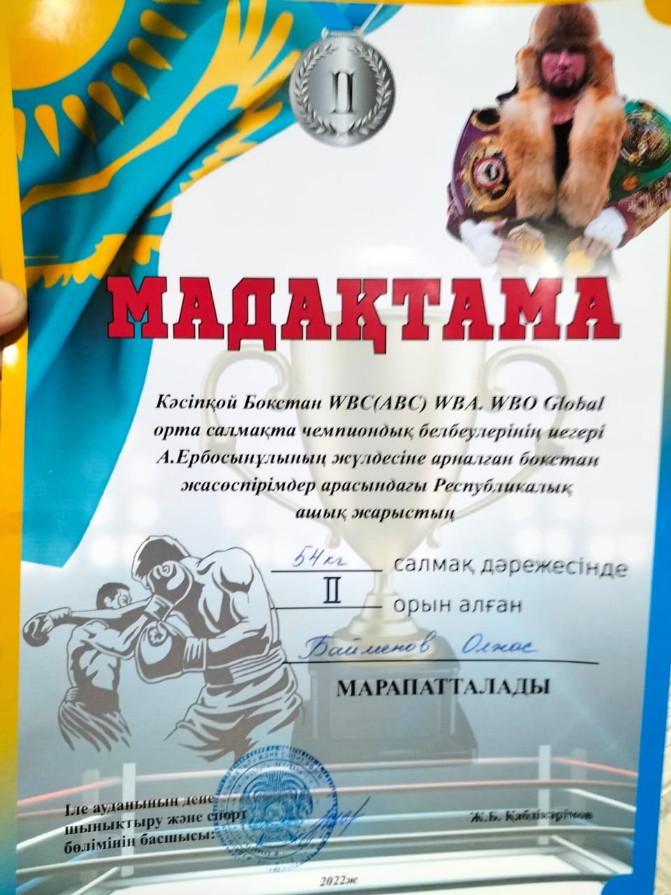 Кәсіпқой бокстан WBC (ABC) WBA, WBO Global орта салмақта чемпиондық белбеулердің иегері А.Ербосынұлының Жүлдесіне арналған бокстан жасөспірімдер арасындағы Республикалық ашық жарыстан мектебіміздің мақтанышы 9 "Д" сынып оқушысы Байменов Олжас жүлделі ІІ-орынға ие болды.