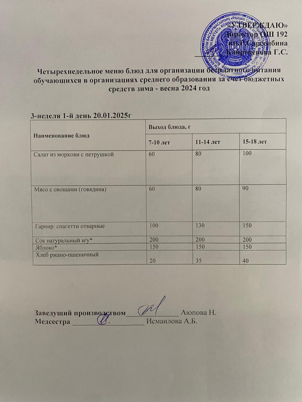 Күнделікті меню 20.01.2025