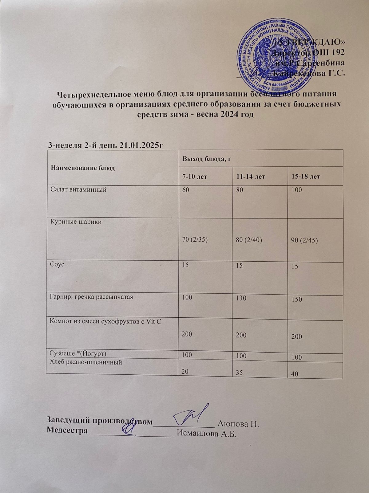 Күнделікті меню 21.01.2025