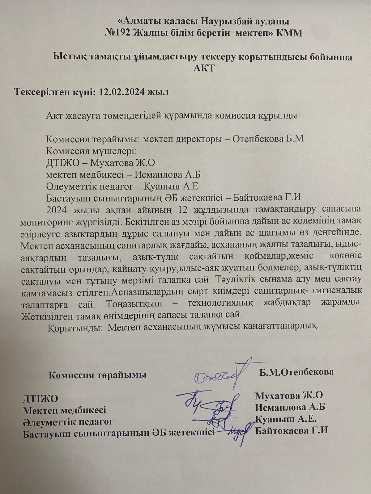 Ыстық тамақты ұйымдастыру, тексеру қорытындысы бойынша АКТ